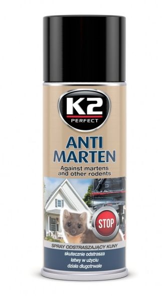 K2 Anti Marten je přípravek, který chrání autodíly před poškozením kunami a hlodavci. Používá se k ochraně kabelů, vodičů a dalších prvků. Výrobek vytváří na povrchu kluzký povlak a zabraňuje hlodavcům v kousnutí, přičemž je neškodný pro zvířata.