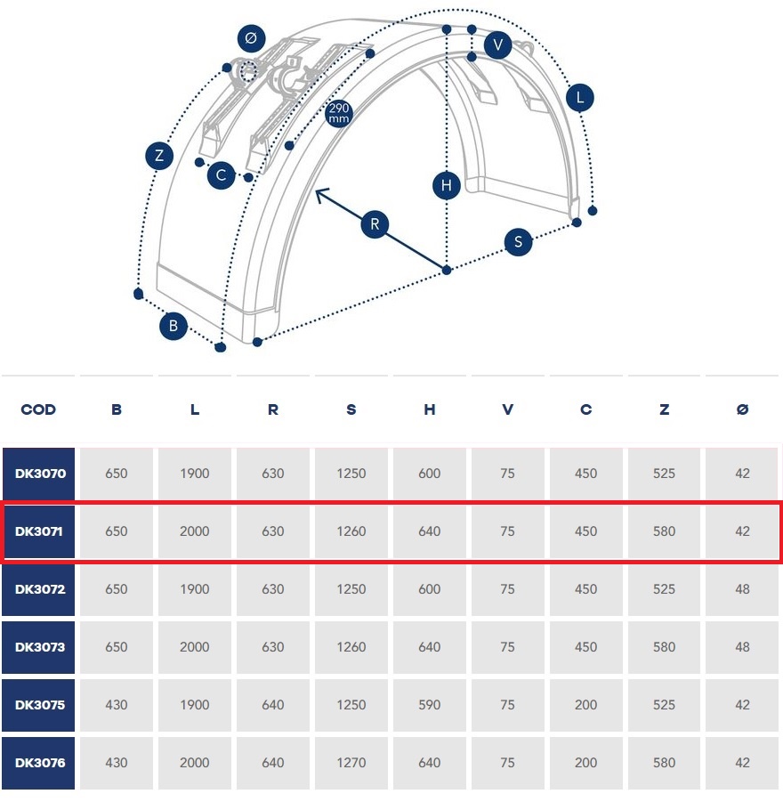 Blatník zadní kulatý - dvoumontáž 650x2000x1260/640 s nastavitelnými držáky, s páskem